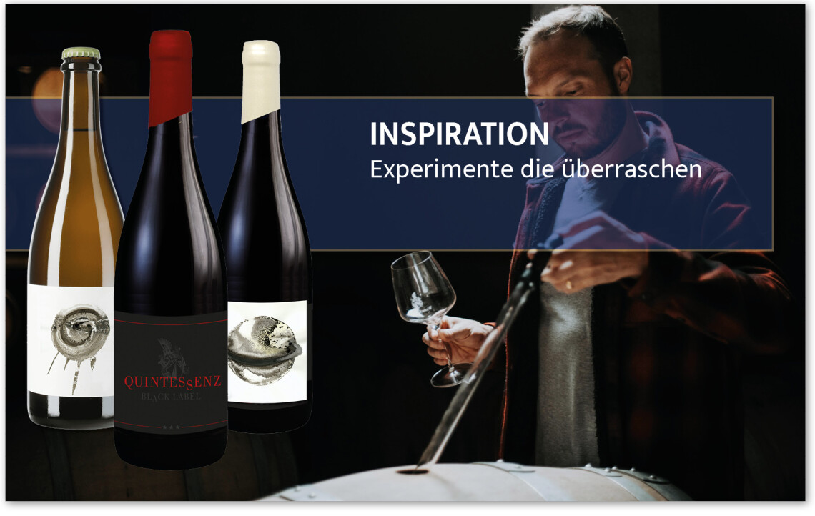 1x 2022 PETNAT 12% vol. | 0.75 l (Das Ursprungsverfahren der Schauweinherstellung) 1x 2023 Weißer Burgunder "S" 13,5 % vol. | 0.75 l (Maischevergorener Weißburgunder) 1x 2018 Quintessenz Blacklabel trocken 14,5% vol. | 0.75 l (Spätburgunder aus getrockneten Trauben) |